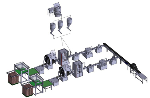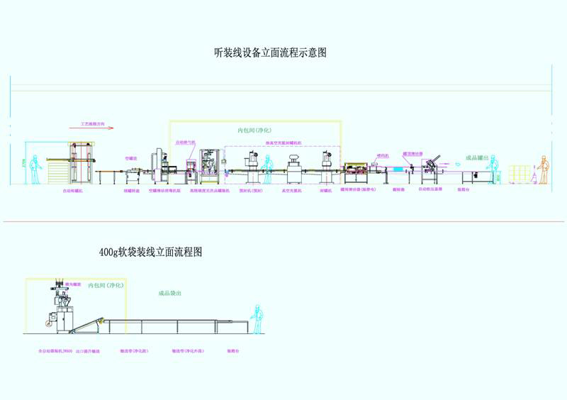 自動卸垛(罐垛)→理罐→消毒(無磁空罐消毒機) →給勺(自動給勺機)→給料(真空上料機;物料和罐裝機在同一平面)→計量罐裝(聽裝雙頭充填機)→封罐(封罐機) →離子風圓周清潔機→底部噴碼(噴碼機自備)→翻罐(模組翻罐)→壓軟蓋(軟蓋機)→人工裝箱(可配套自動裝箱碼垛)
